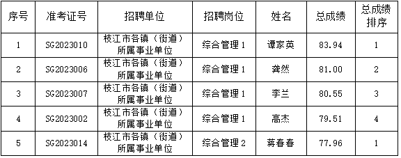 根据《枝江市2023年面向优秀城市社区工作者专项招聘事业单位工作人员公告》规定,经报名、资格审查、笔试、面试、体检和考察等程序,现将枝江市2023年面向优秀城市社区工作者专项招聘事业单位工作人员拟聘用人员予以公示,名单如下: