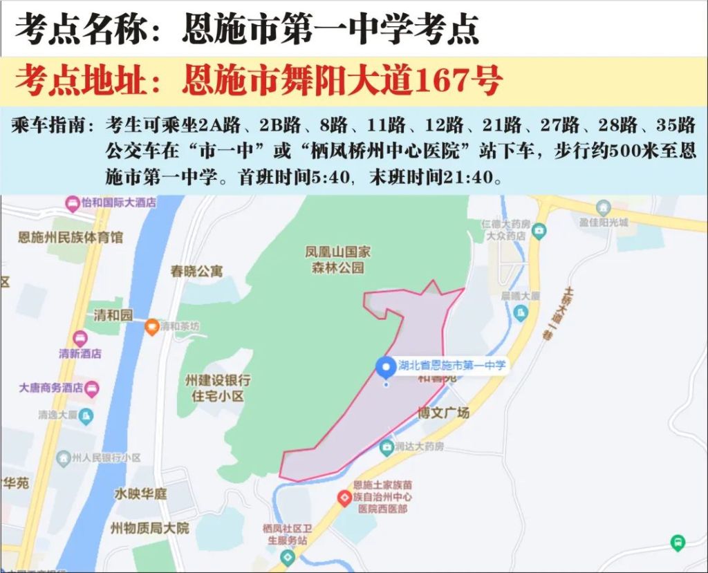 1.乘车指南:考生可乘坐2A路、2B路、8路、11路、12路、21路、27路、28路、35路公交车在“市一中”或“栖凤桥州中心医院”站下车,步行约500米至恩施市第一中学。首班时间5:40,末班时间21:40。