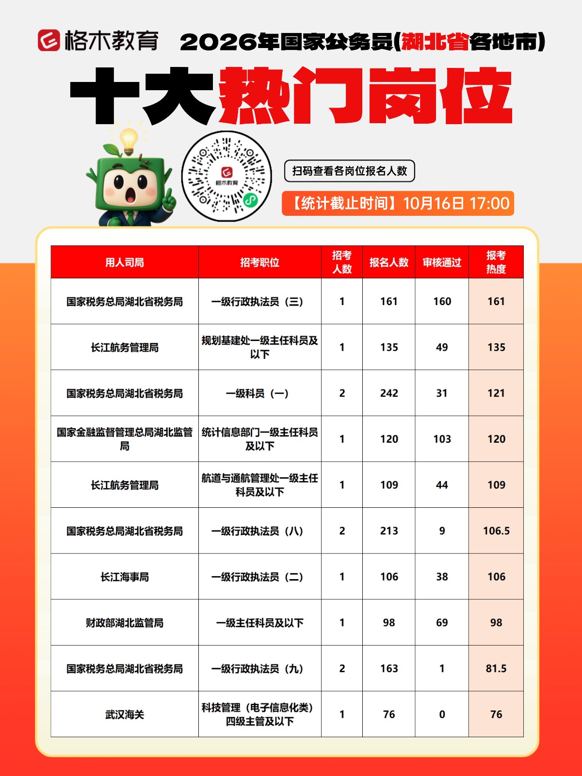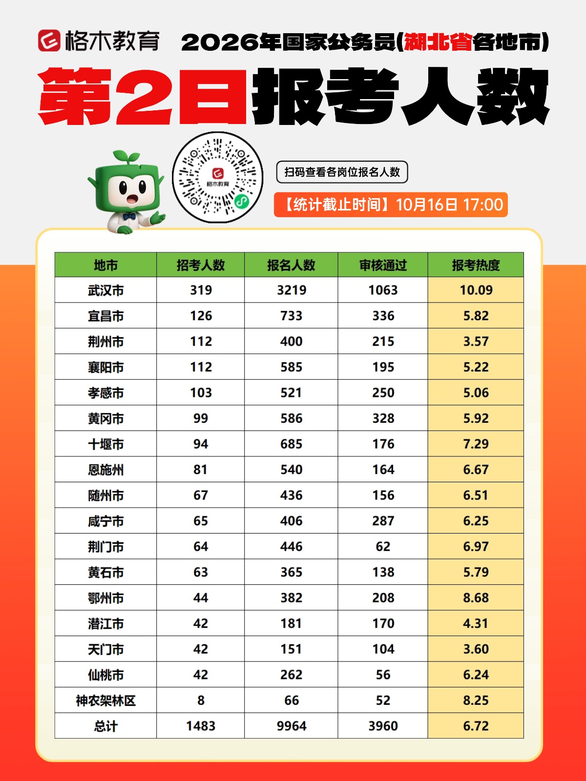 2026年国考首日报名人数统计:截至10月16日17时,湖北招录1483人,报名人数9964人,审核通过3960人。