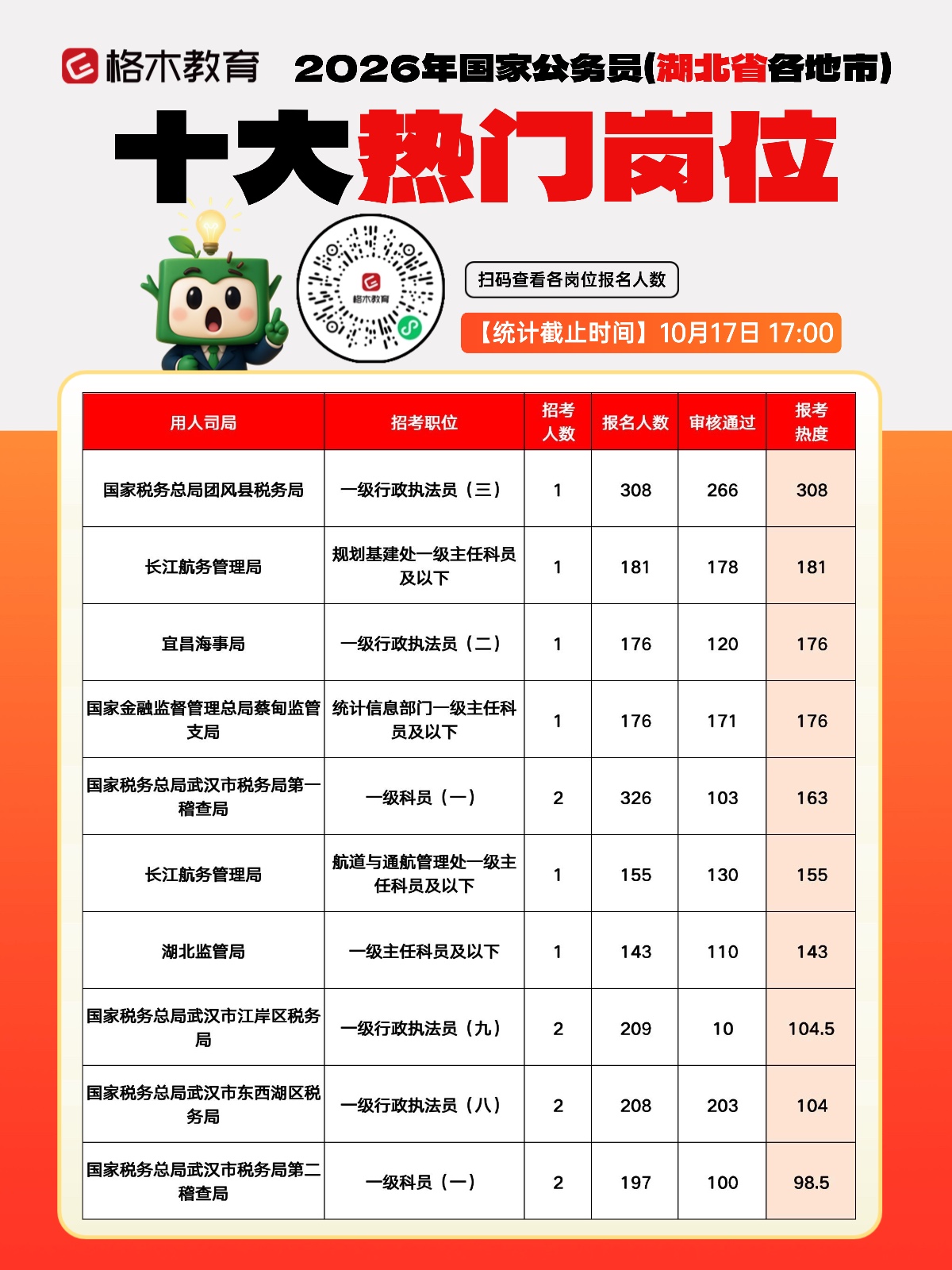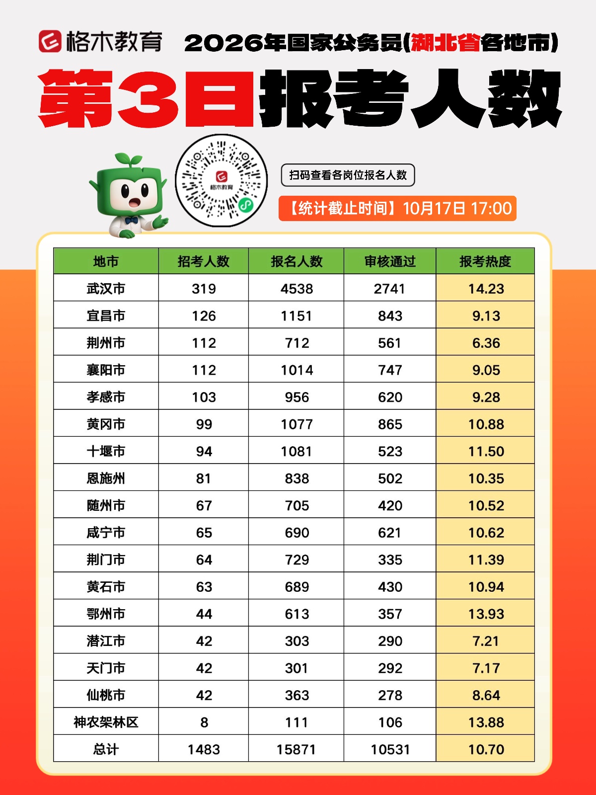 2026年国考首日报名人数统计:截至10月16日17时,湖北招录1483人,报名人数15871人,审核通过10531人。