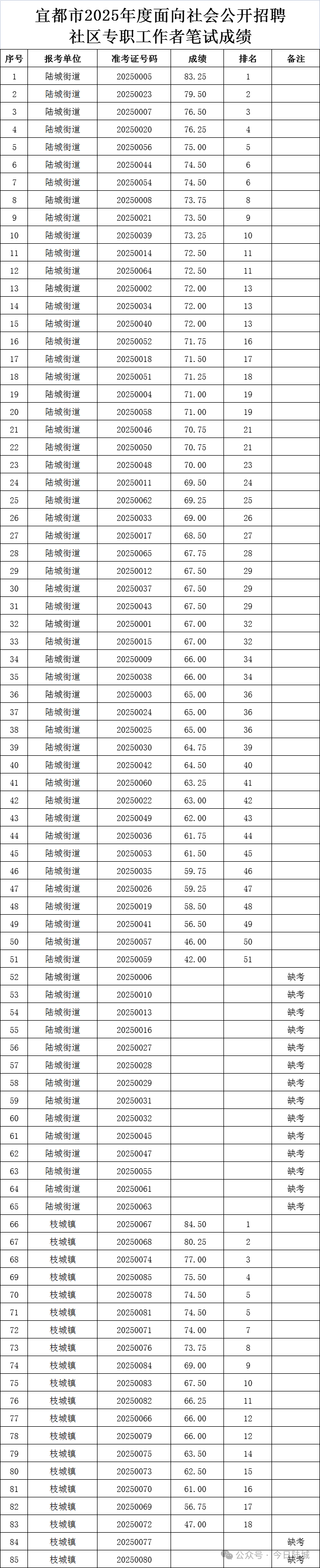 根据《宜都市2025年度面向社会公开招聘社区专职工作者公告》相关程序,现将笔试成绩予以公示。