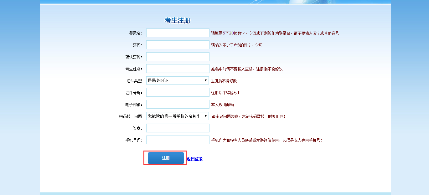 点击“注册”按钮,进入考生注册页面,如下图所示:
