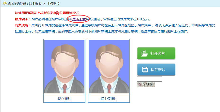在考生登录处进行登录,登录成功后跳转到上传照片页面,下载照片审核工具,如下图所示: