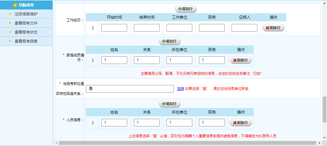 填写报名信息必须真实、准确、完整,报考者提交的有关申请材料或者信息不实的,认定为报名无效,终止录用程序;信息填报不全导致未通过招录机关资格审查的,后果由报考者自负。对学习和工作经历栏目,应按时间先后顺序,从高中开始,填写何年何月至何年何月在何单位(学校)工作(学习)、任何职。对大学期间的学习经历,须填写清楚学校、院系、专业名称。
