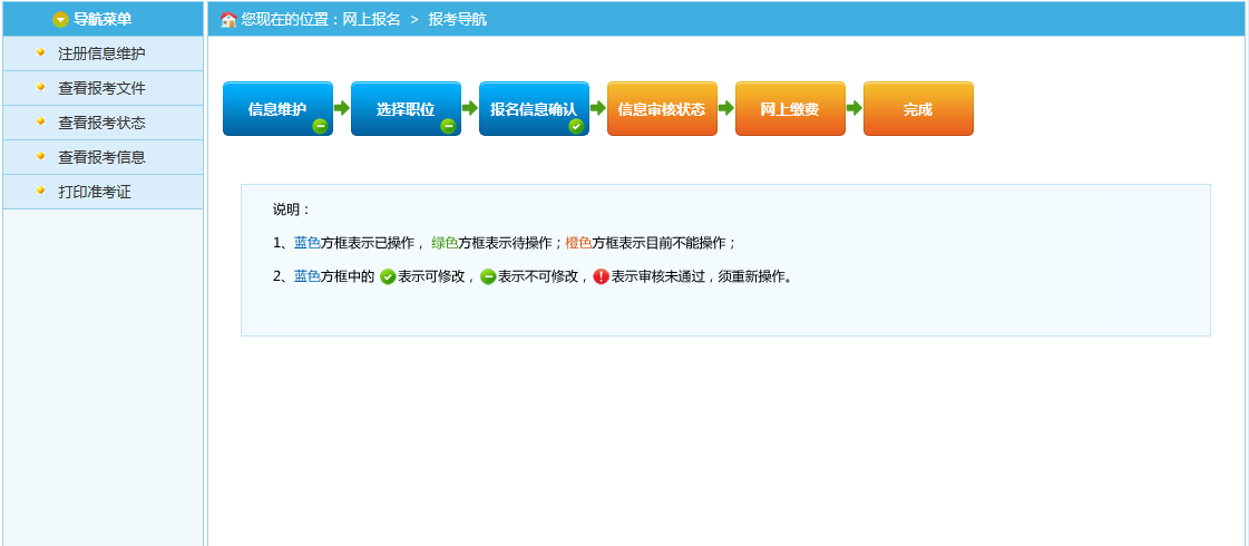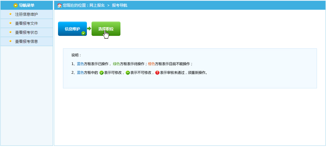 请根据自身情况查询适合的职位报考。(注意:若被某个职位审核不通过,需在“信息维护”中修改个人信息,且还想继续报考该职位,须再次选择职位,并进行“报名信息确认”。 )