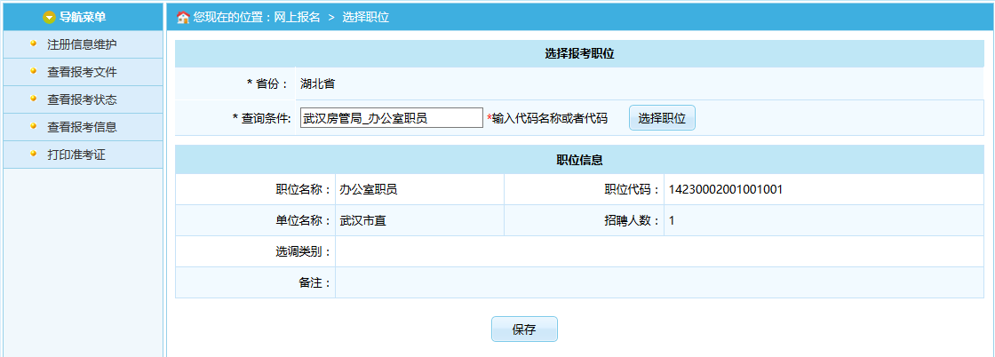 选择相应的职位,点击“保存”按钮,提示保存成功,可以跳转到报考流程页面,如下图所示: