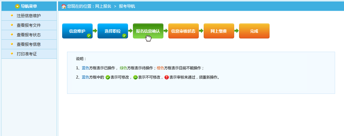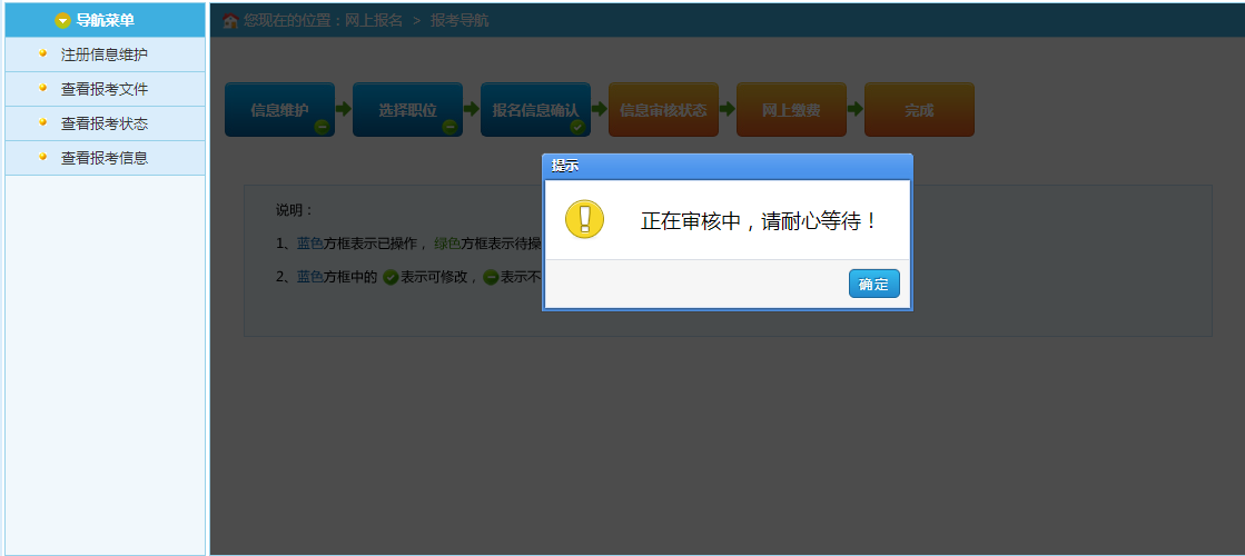 通过点击“确认”按钮,提示确认成功后跳转到报考流程页面,进入资格审核状态,等待审核员审核。