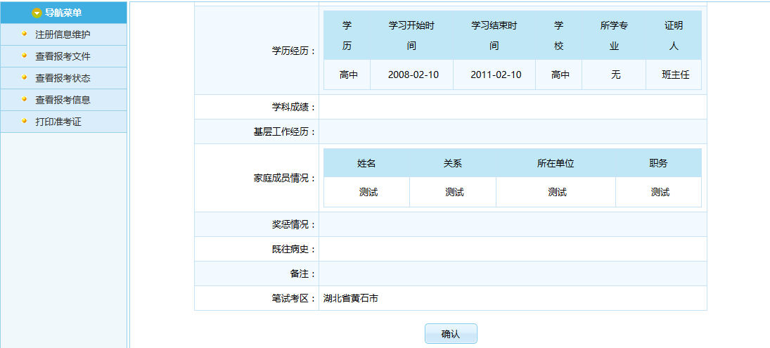 通过点击“报名信息确认”按钮后,跳转到报名信息确认页面,如下图所示: