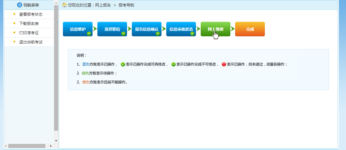 审核通过的考生可以进行网上缴费,点击报考流程中“网上缴费”选项,进入网上缴费的页面,如下图所示: