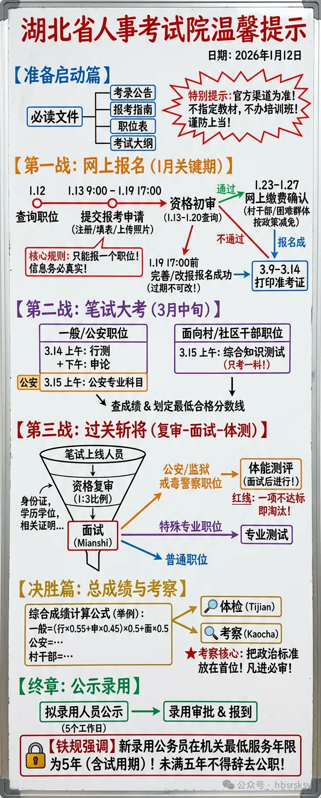 2026湖北省公务员考试公告已发布,今年湖北省考共计招录8027人,考生可于2026年1月13日9:00至1月19日17:00期间登录“湖北省人事考试网”(https://rst.hubei.gov.cn/hbrsksw/)进行网上报名。2026湖北省考公共科目笔试时间为3月14日,公安专业科目考试和综合知识测试时间为3月15日。笔试主考区设在武汉市,各市州、直管市、神农架林区设置分考区。