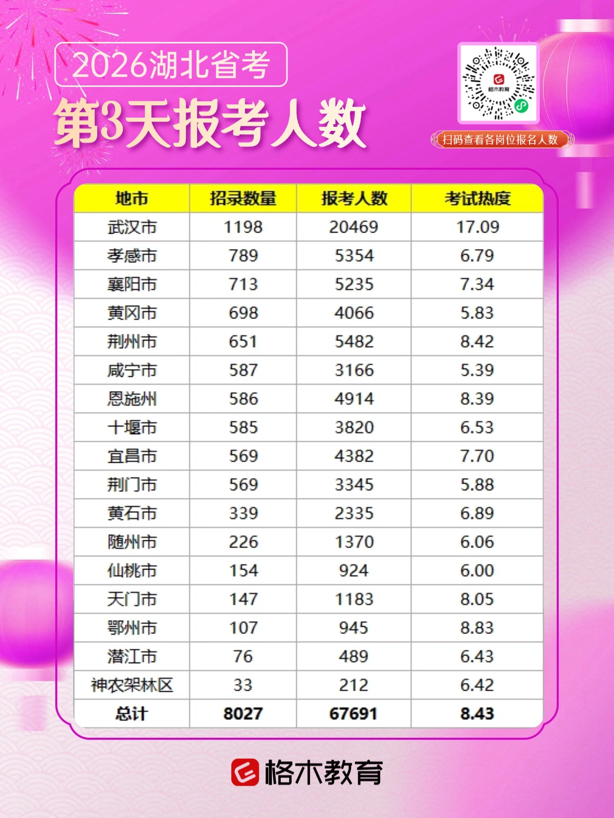 2026湖北省考报名人数统计:截至2026年1月15日17:00,已有67691人报名