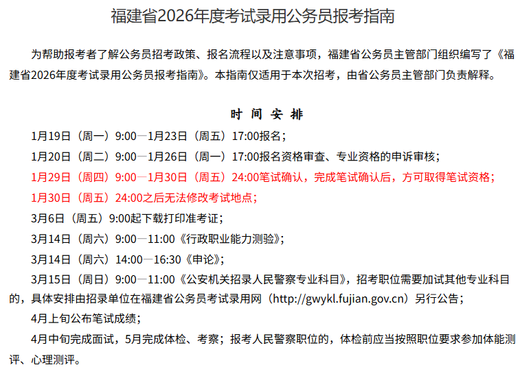 1月29日9:00至1月30日24:00,通过资格审查的报考者应登录福建考录网完成笔试确认手续,未在规定时间完成确认的,视为放弃考试资格。