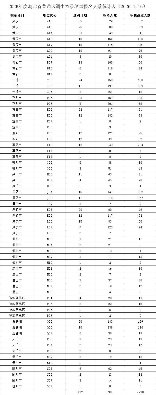 2026年湖北省普通选调生招录笔试报名人数统计表(2026.1.16)