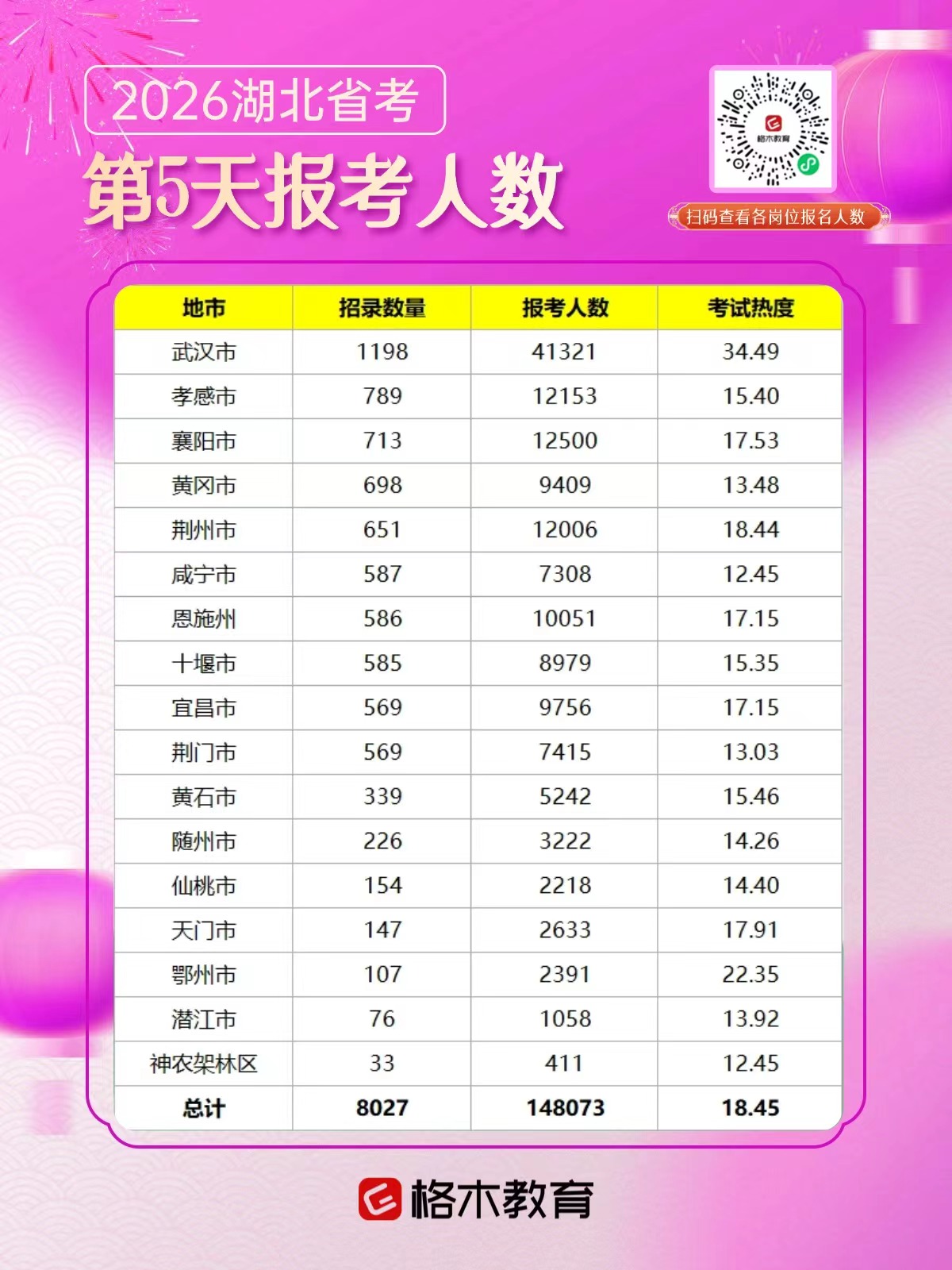 2026湖北省考报名人数统计:截至2026年1月16日17:00,已有148073人报名