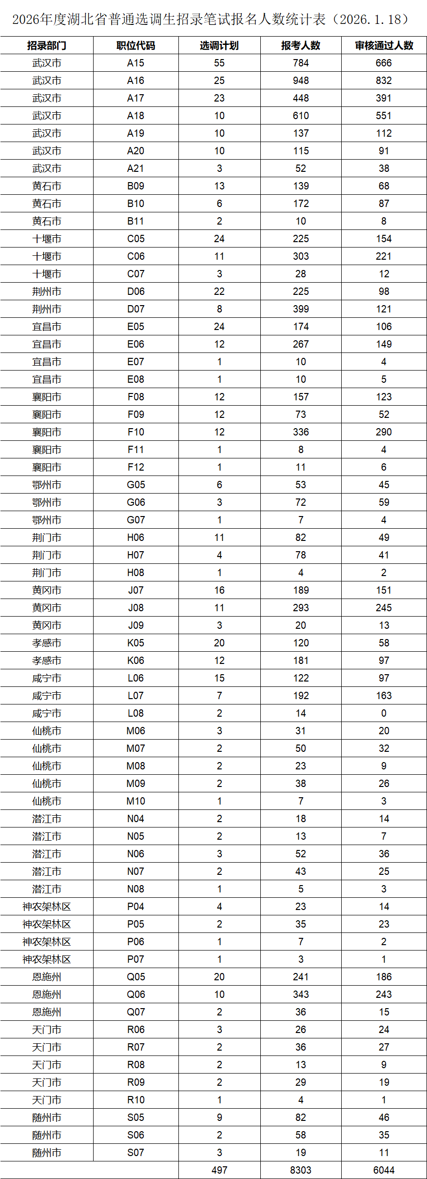 2026年湖北省普通选调生招录笔试报名人数统计表(2026.1.18)