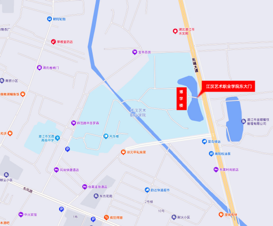 考点为江汉艺术职业学院,考场全部设于博学楼,考生须从学院东大门进入考点,陪考人员和社会车辆不得进入考点,具体方位见下图: