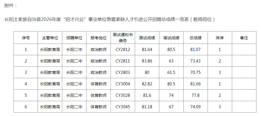 根据《长阳土家族自治县2026年度“招才兴业”事业单位急需紧缺人才引进公开招聘公告·中南财经政法大学站》,现将长阳土家族自治县2026年度“招才兴业”事业单位急需紧缺人才引进·中南财经政法大学站教师岗位总成绩予以公告。